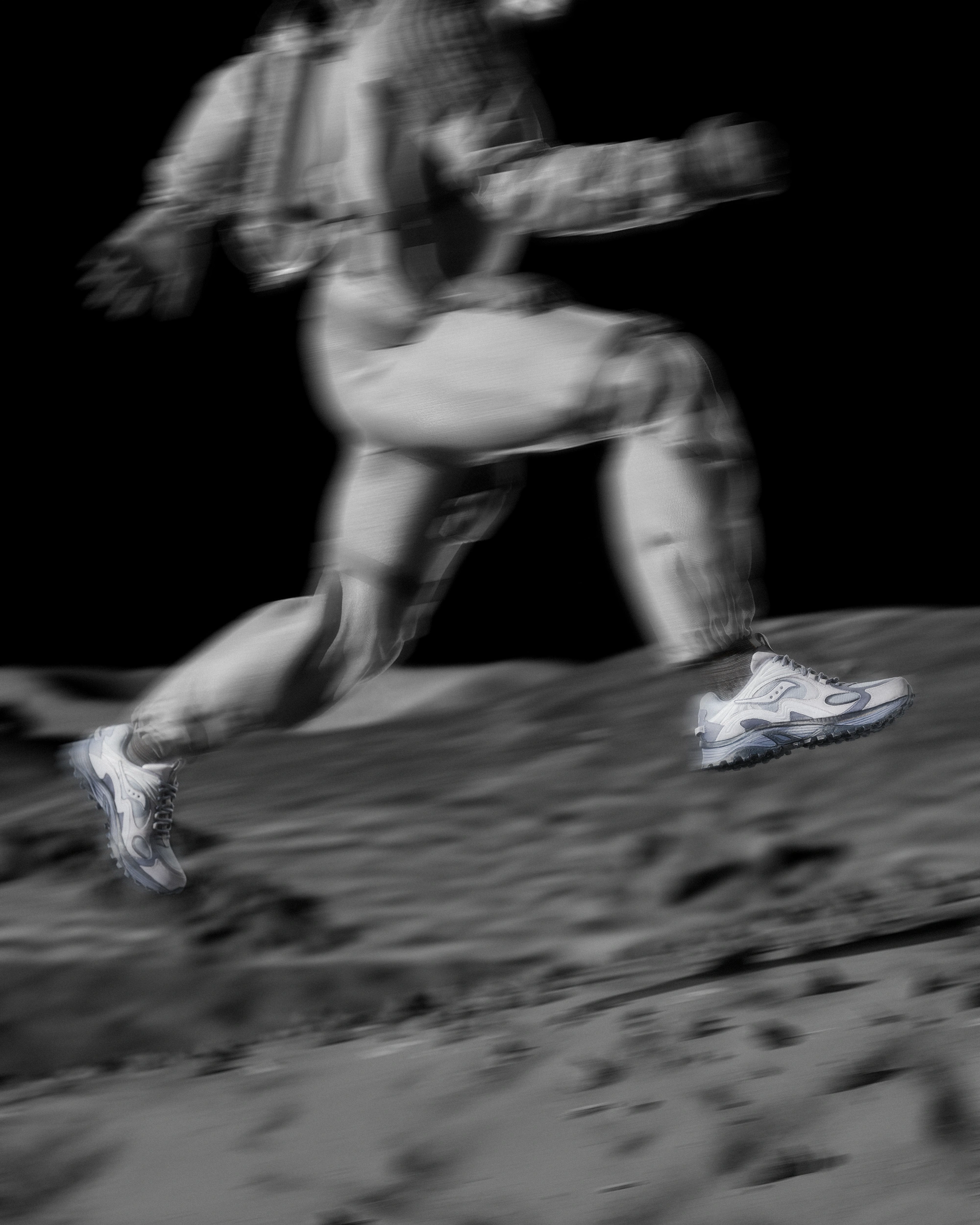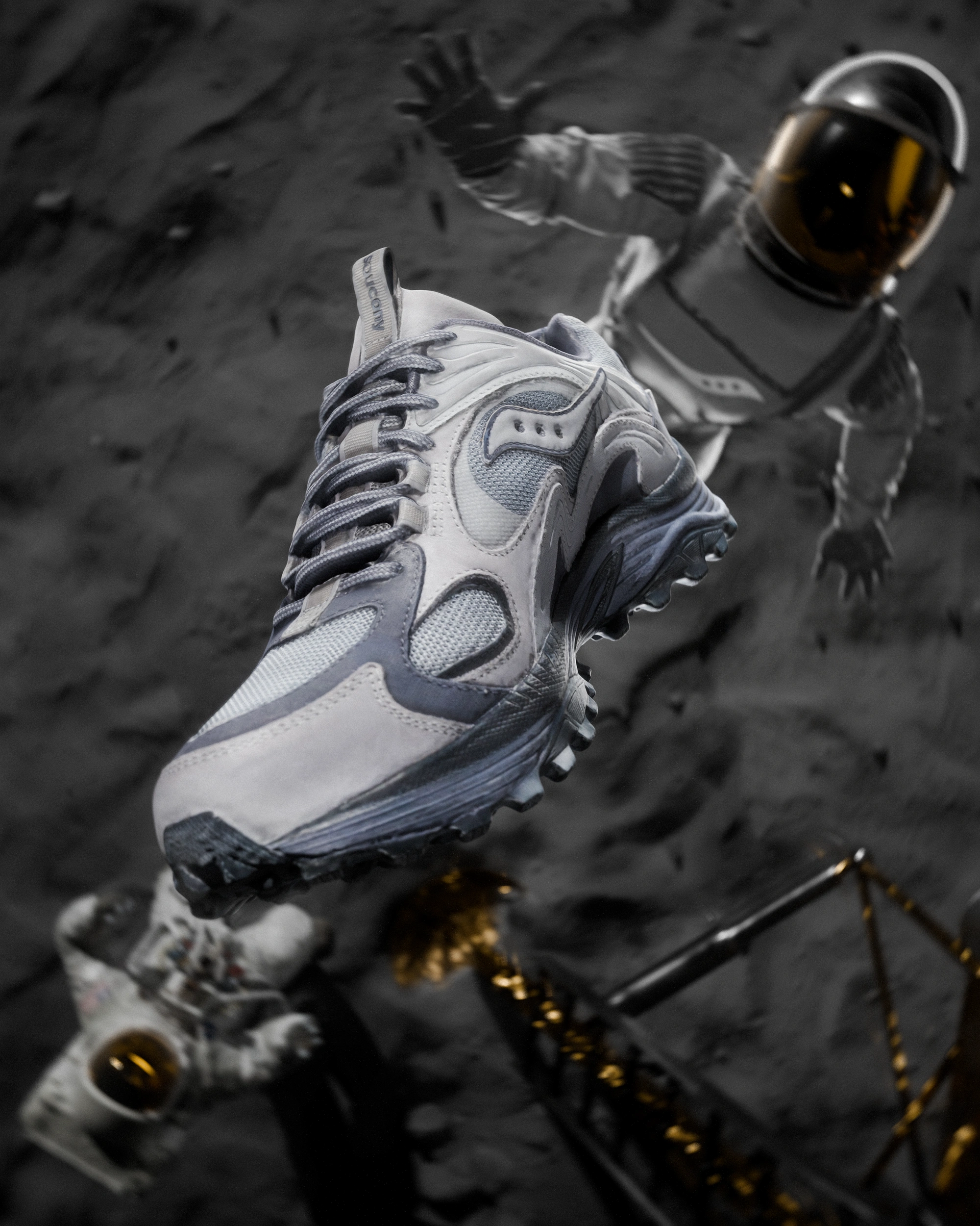 The project was conceived to introduce the Grey Pack: two existing Saucony silhouettes reimagined through lunar-inspired tones and textures, unveiled through a narrative that blends heritage, imagination, and a bold redefinition of “first steps.”